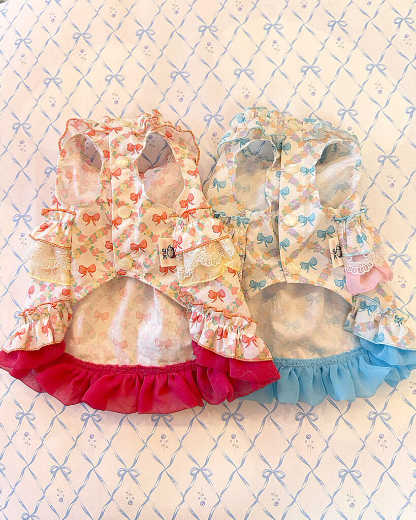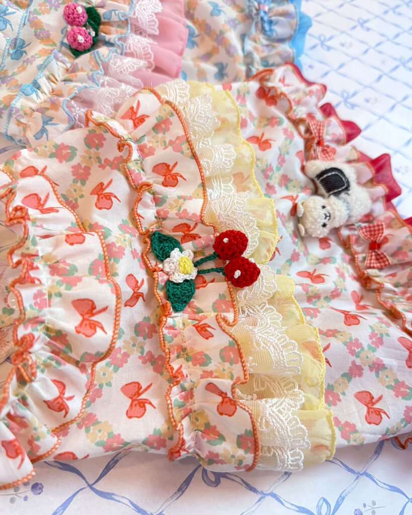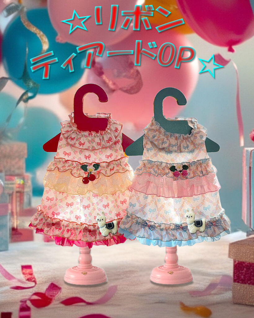J&Kanimalsから、ガーリーなワンピースの登場です~♪小さなリボンとフラワー柄が散りばめられ、布地にふんわりフリルをたっぷりと重ねてゴージャスに仕上げました\(^_^)/ハイウェスト部分には、さくらんぼモチーフをつけてさらに可愛さUPです(^^♪レースとチュールを重ねたスカートは歩くたびに揺れて注目度UPですヨ(゜▽゜)