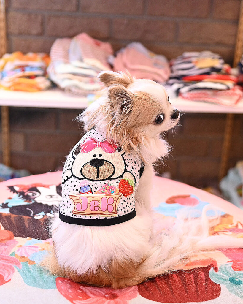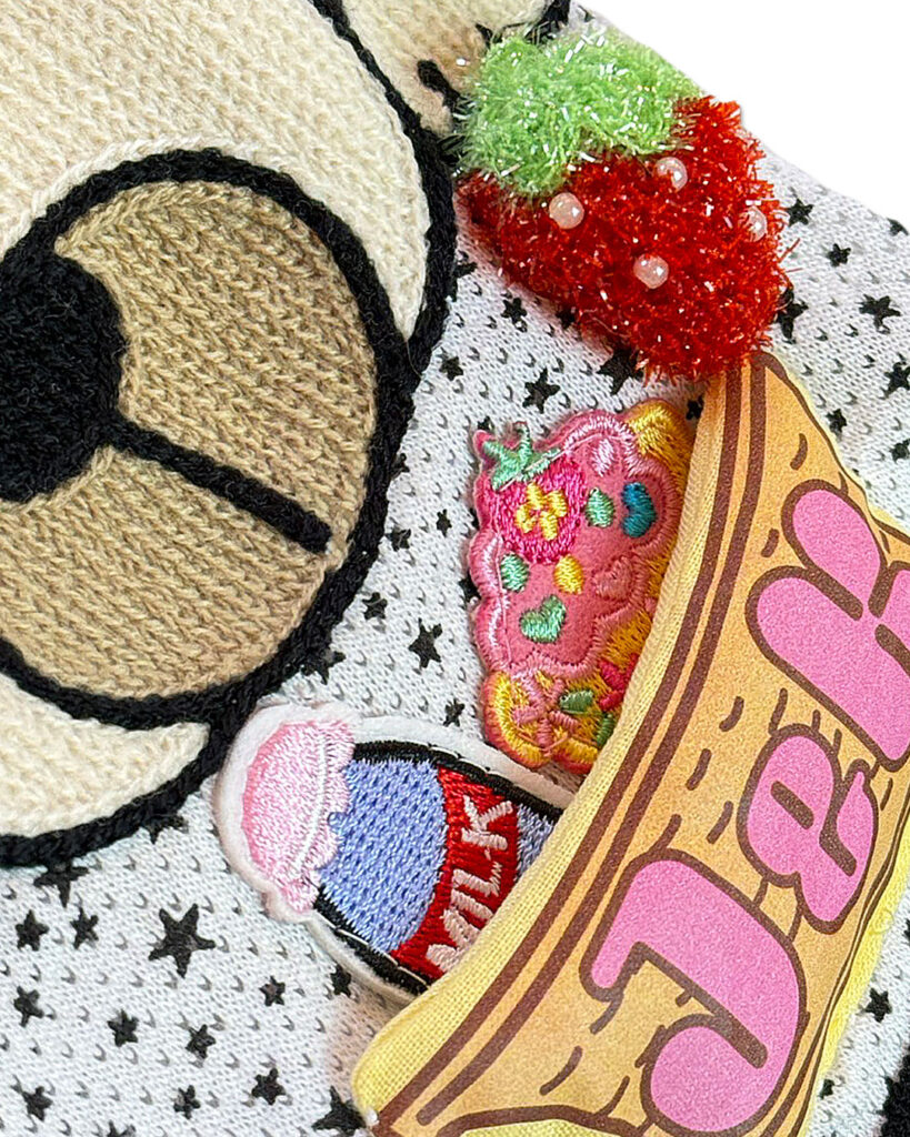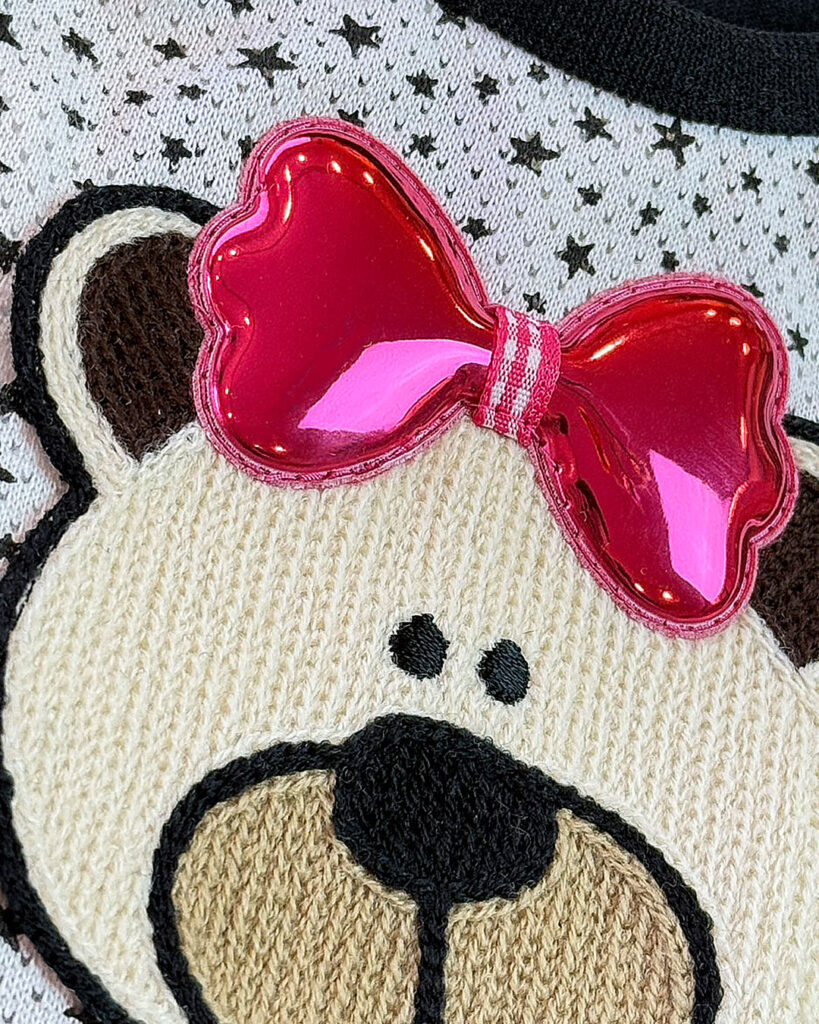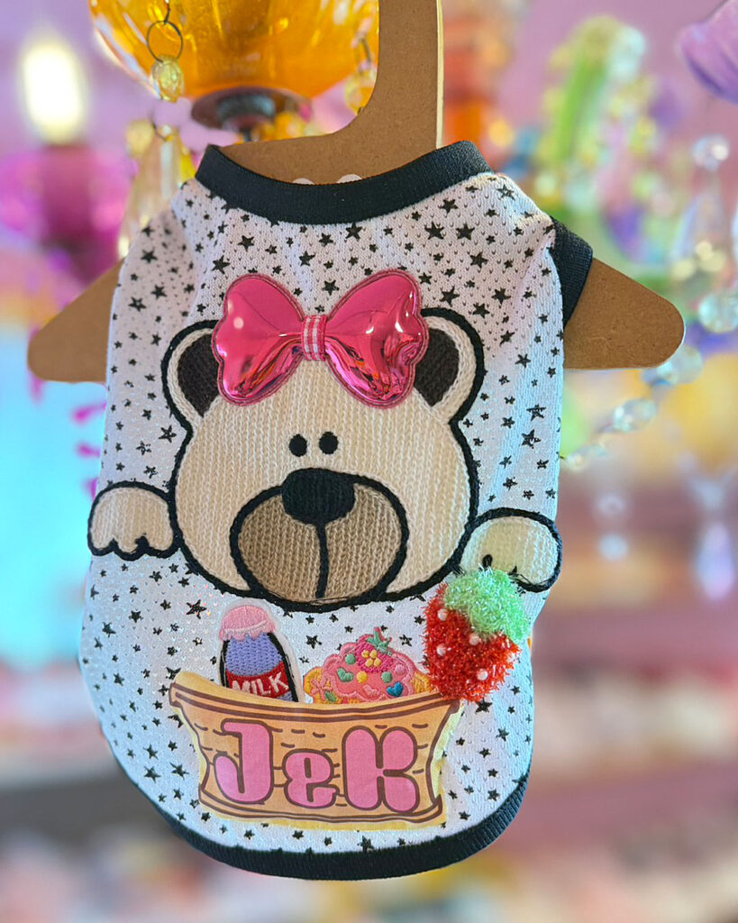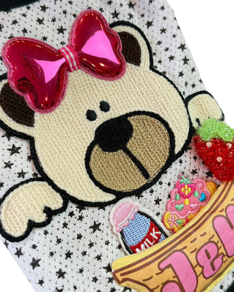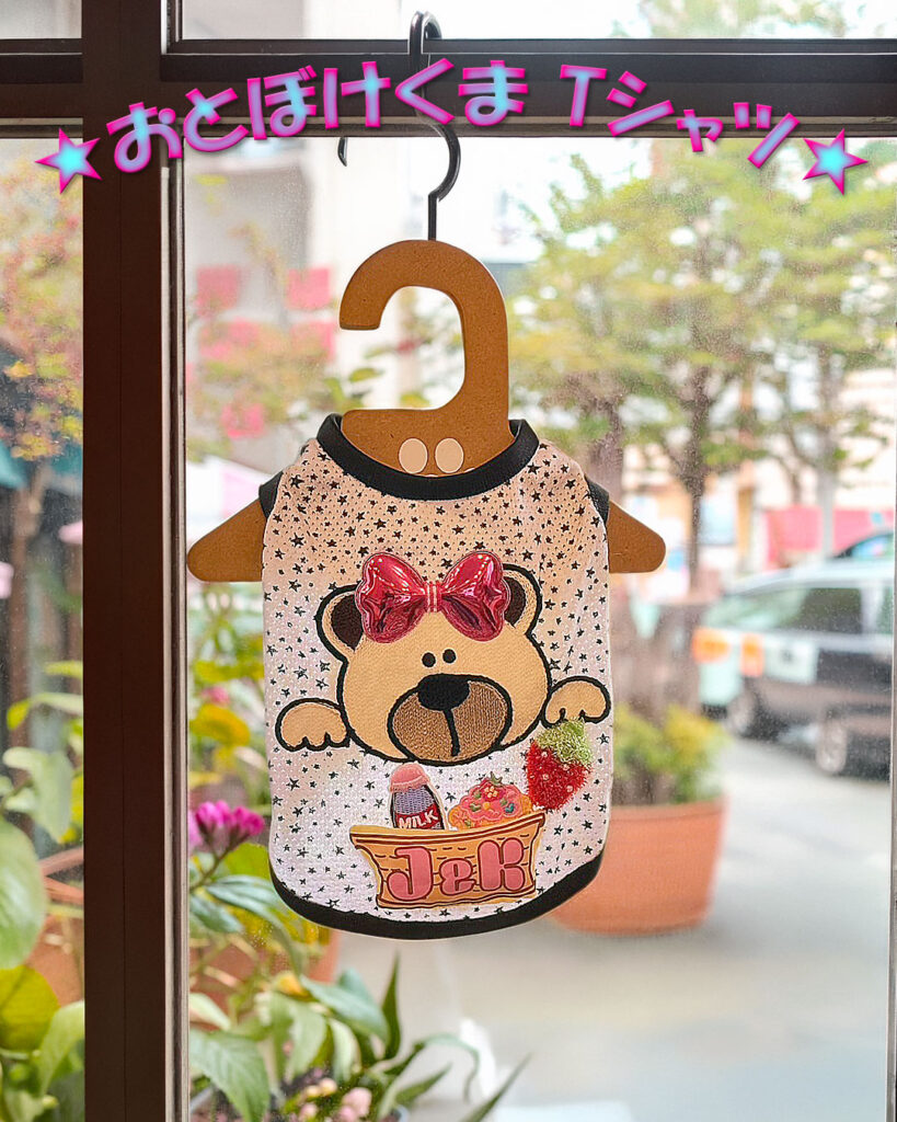 J&Kanimalsから、ポップなTシャツの登場です~♪星柄のメッシュ布に、おとぼけくまさんのワッペンをつけてポイントに=^-^=J&Kのバケットの中にはミルクやケーキ.イチゴを入れました♪くまさんにつけた大きなリボンがキラッと光って可愛いですヨ\(^_^)/男の子・女の子にも似合うトップスに仕上がりました。チュチュなどに重ね着しても良いですネ(゜▽゜)