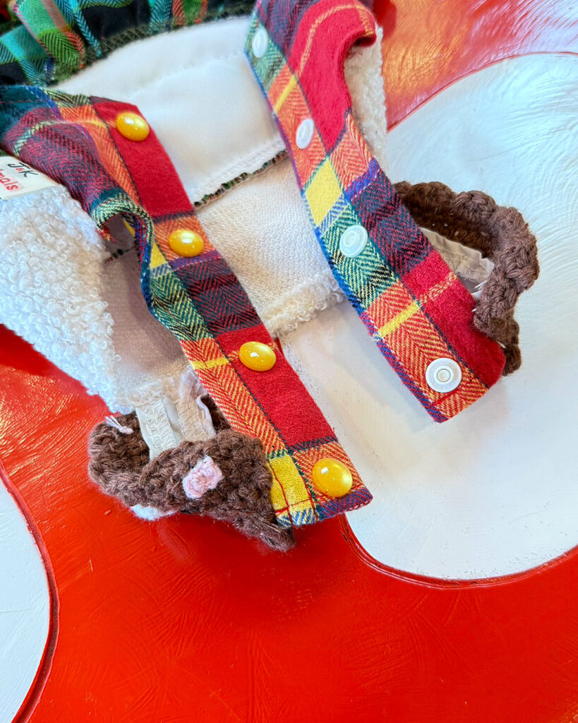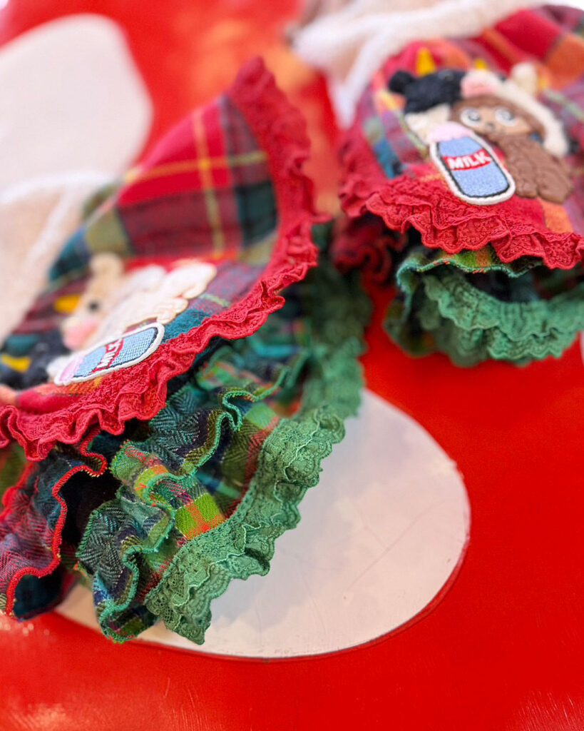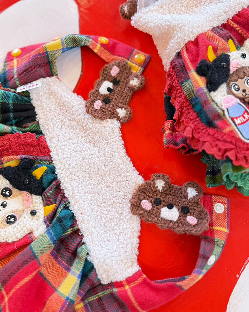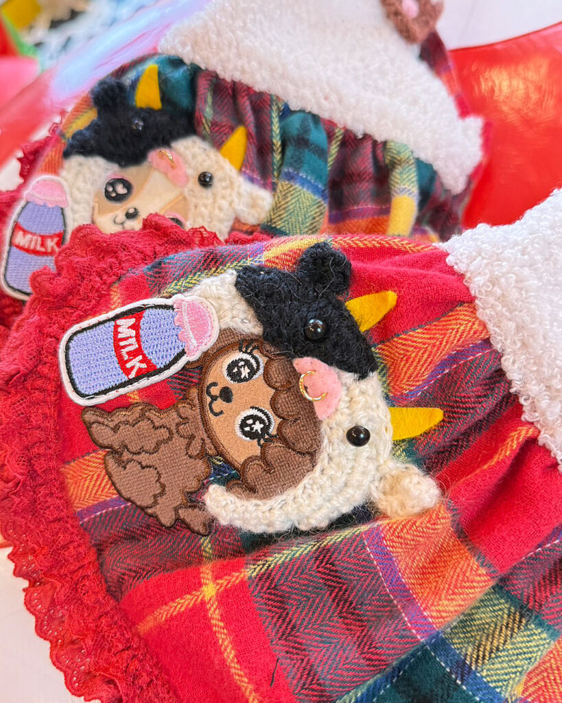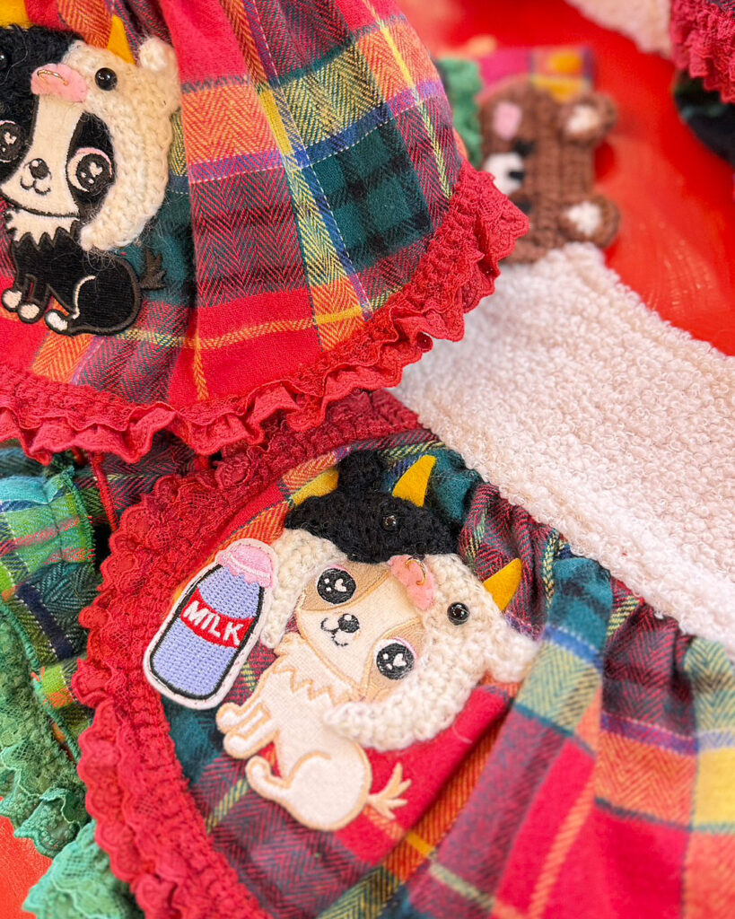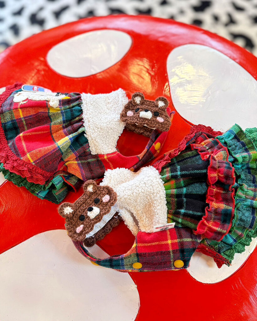 J&Kanimalsから、とびっきりキュートなワンピースが登場です~♪赤×緑のタータンチェックのスカートにレースフリルをあしらい、ガーリーに仕上げました。さらに、J&Kオリジナルキャラクターをプラス(^^♪キャラクターには、1点1点手編みの“うしさん帽子”をかぶせて、ミルクを持たせています♪上身頃には、モコモコのファー素材を使用し=^-^=お肩には、くまさんの編みモチーフをつけて可愛いポイントにしました\(^_^)/スカートはアシンメトリーでボリューム感のあるデザイン。とってもオシャレな仕上がりのワンピースです♪前あきタイプでお袖がないデザインなので、限定商品らしく細部までこだわった作りになっています??これからのイベントシーズンにも大活躍まちがいなしです~(゜▽゜)